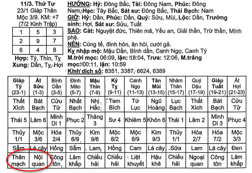 Giờ mở huyệt không cố định, phải tra trong Lịch Cát Tường, ví dụ: