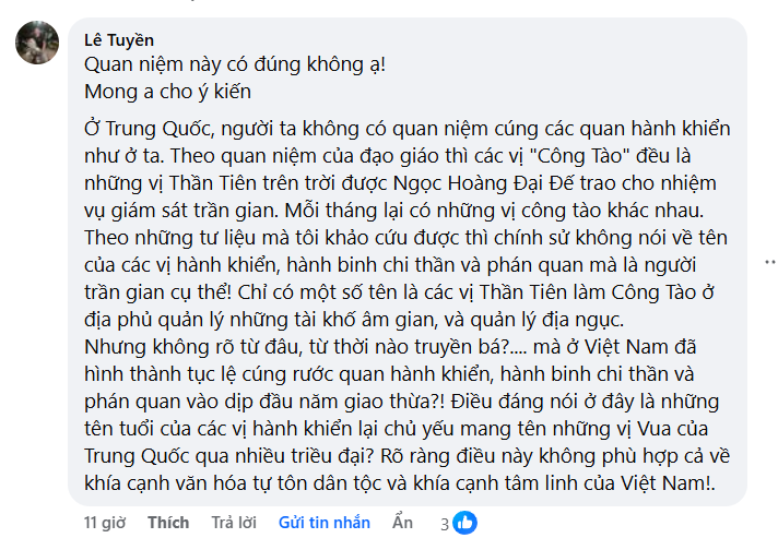 Quan niệm này có đúng không ạ!Mong a cho ý kiếnỞ Trung Quốc, người ta không có quan niệm cúng các quan hành khiển như ở ta. Theo quan niệm của đạo giáo thì các vị “Công Tào” đều là những vị Thần Tiên trên trời được Ngọc Hoàng Đại Đế trao cho nhiệm vụ giám sát trần gian. Mỗi tháng lại có những vị công tào khác nhau.Theo những tư liệu mà tôi khảo cứu được thì chính sử không nói về tên của các vị hành khiển, hành binh chi thần và phán quan mà là người trần gian cụ thể! Chỉ có một số tên là các vị Thần Tiên làm Công Tào ở địa phủ quản lý những tài khố âm gian, và quản lý địa ngục.Nhưng không rõ từ đâu, từ thời nào truyền bá?…. mà ở Việt Nam đã hình thành tục lệ cúng rước quan hành khiển, hành binh chi thần và phán quan vào dịp đầu năm giao thừa?! Điều đáng nói ở đây là những tên tuổi của các vị hành khiển lại chủ yếu mang tên những vị Vua của Trung Quốc qua nhiều triều đại? Rõ ràng điều này không phù hợp cả về khía cạnh văn hóa tự tôn dân tộc và khía cạnh tâm linh của Việt Nam!.